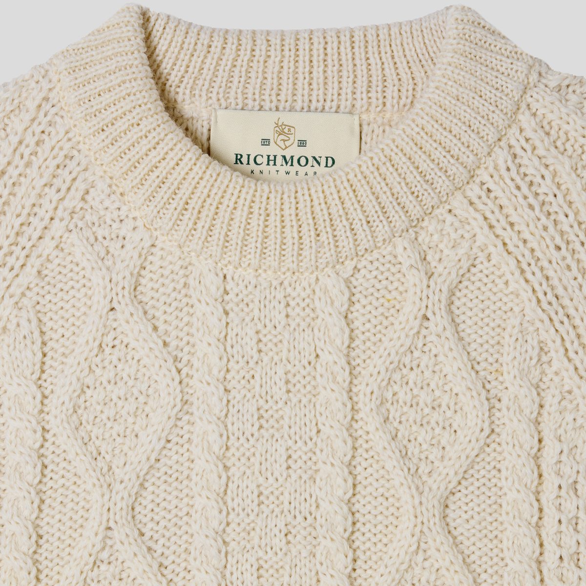 The traditional Crew Neck Aran Sweater with raglan sleeves, Richmond by Crystal Knitwear.