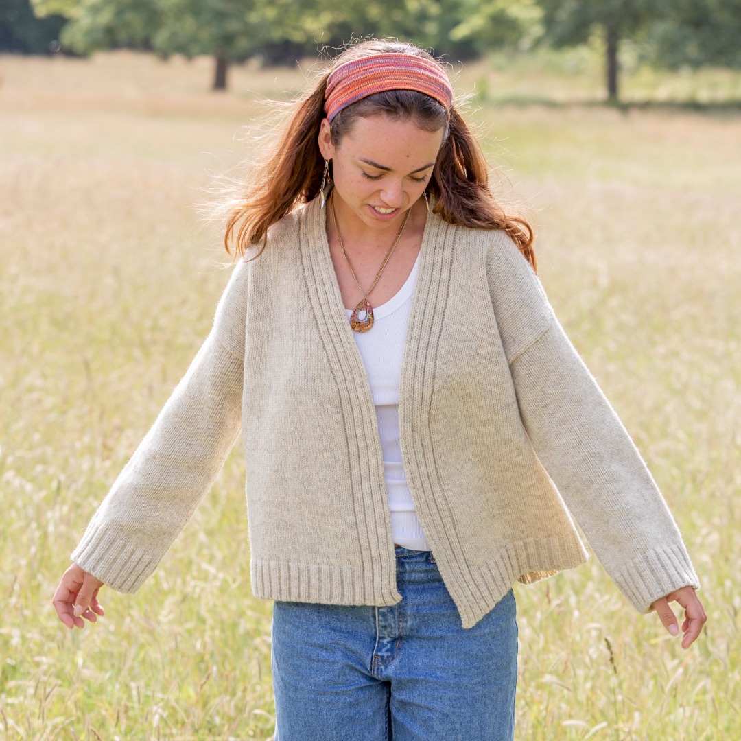 Easy fitting, edge-to-edge cardigan made with London wool. The length is approximately 60cm with wider, kimono style sleeves. The deep ribbed hem and cuffs match the integrally knitted neck trim.