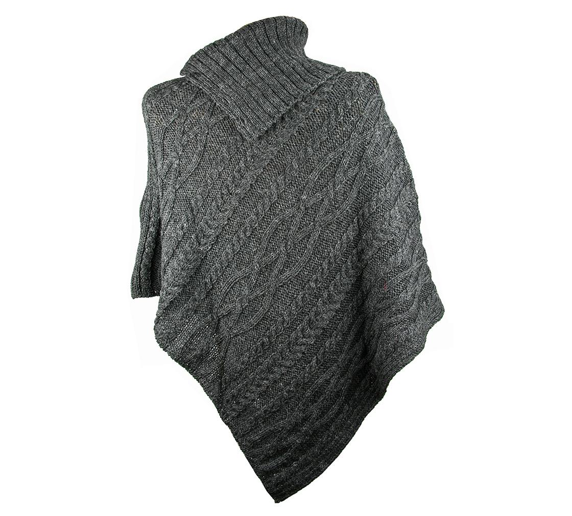 This ladies poncho features a big cowl neck collar and is knitted in a traditional Aran pattern. This geometric pattern hails from the Aran islands in Ireland, not to be confused with the Isle of Arran – two ‘r’s! – in Scotland.