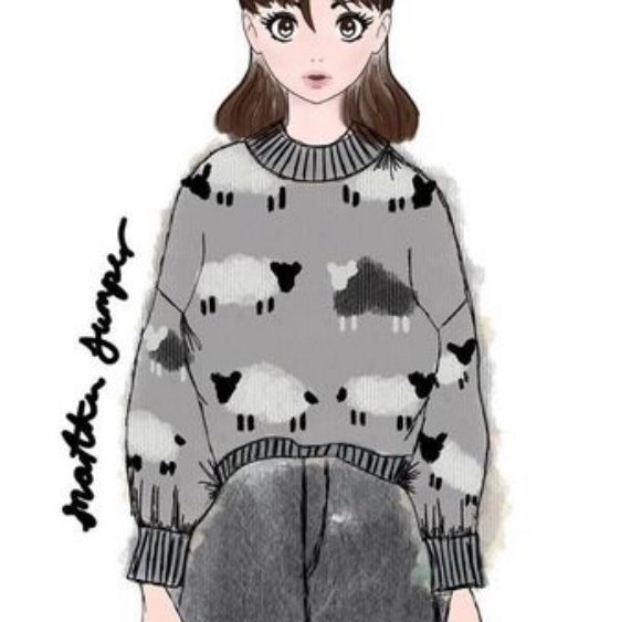 The jumper is light grey with 5 white and 1 black sheep on both the front and the back, with sheep also down the sleeves.