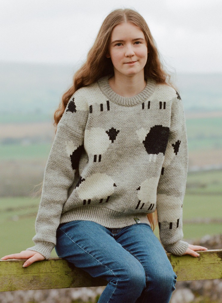 A chunky British Wool jumper with a flock of white (and one black) sheep.
