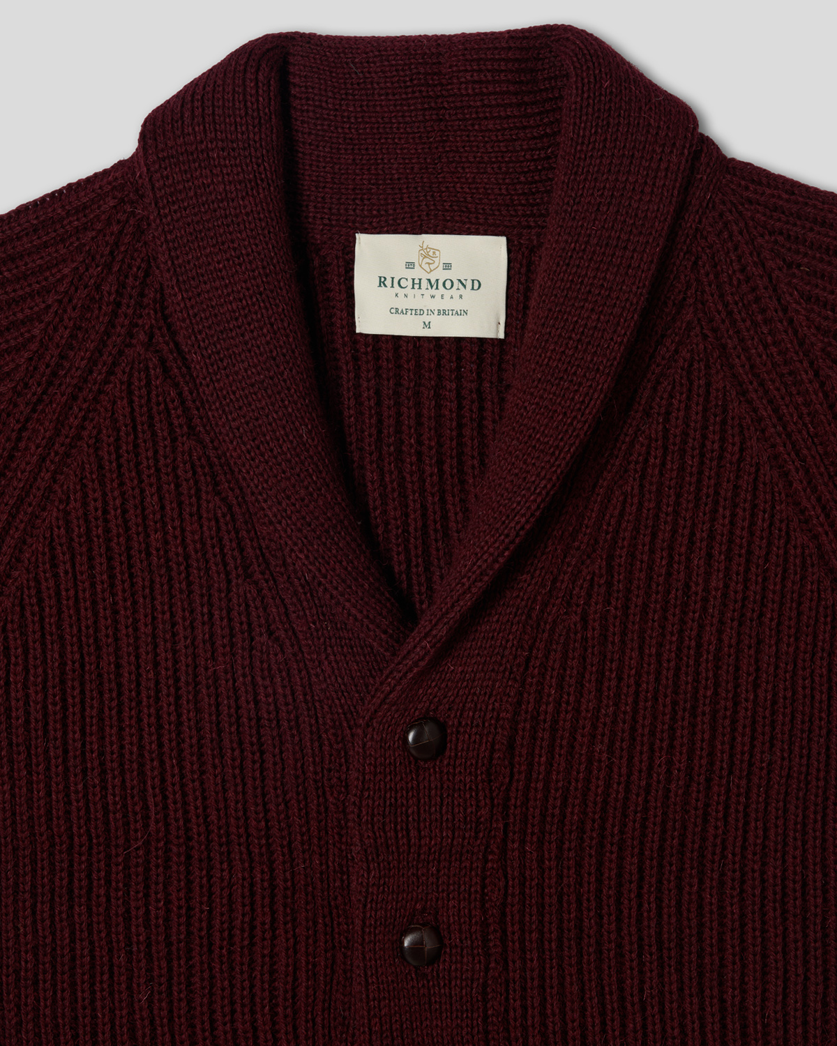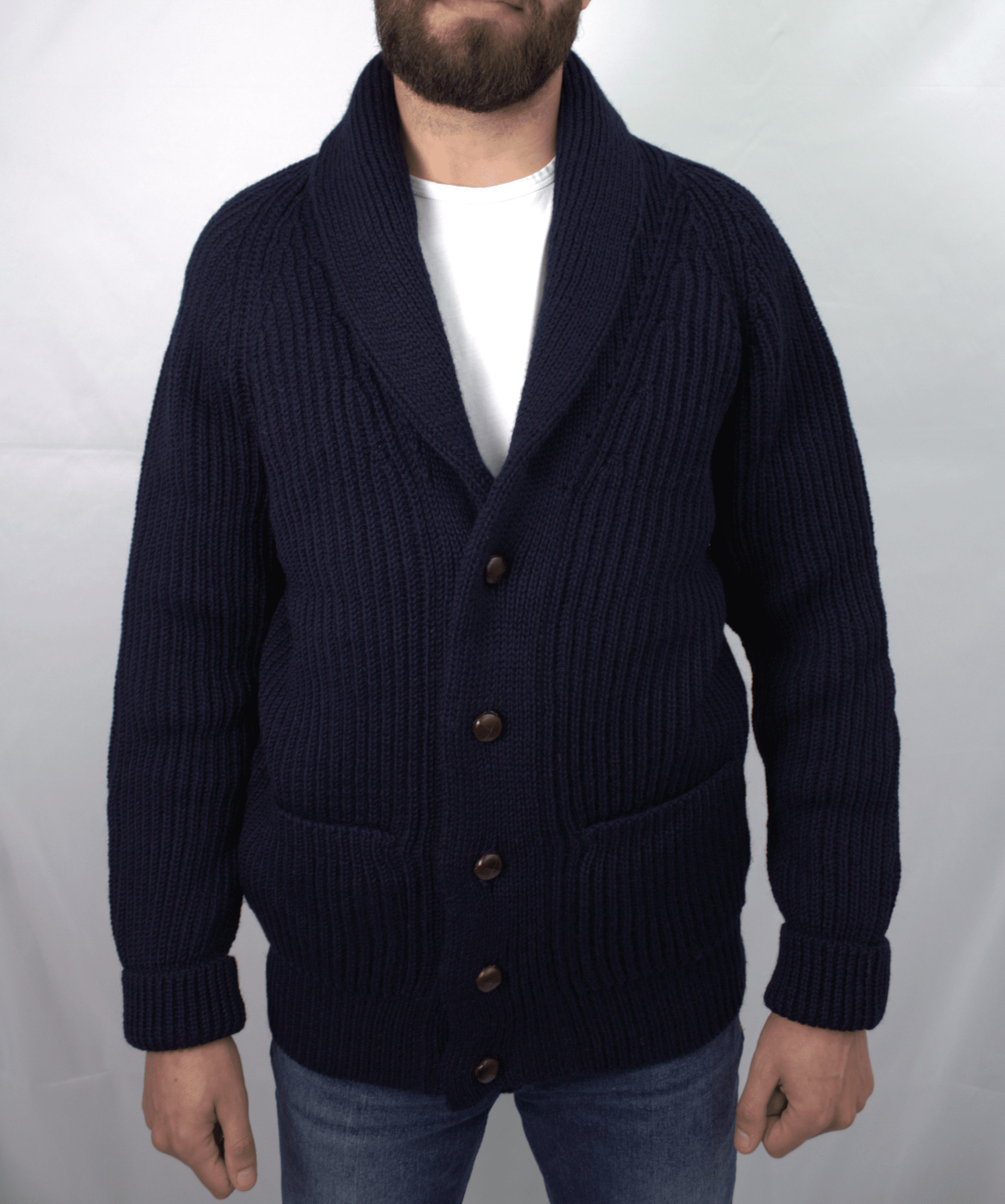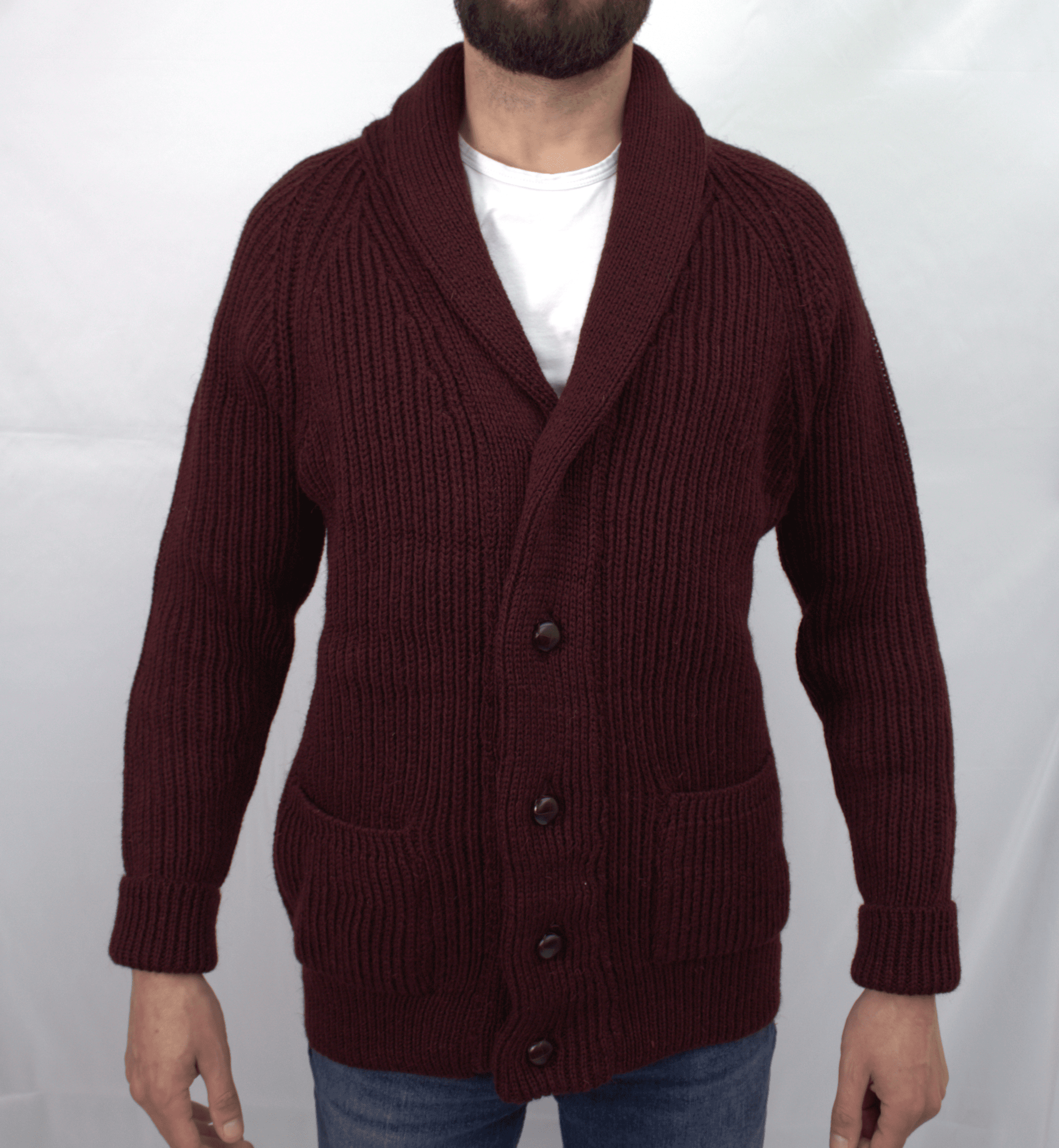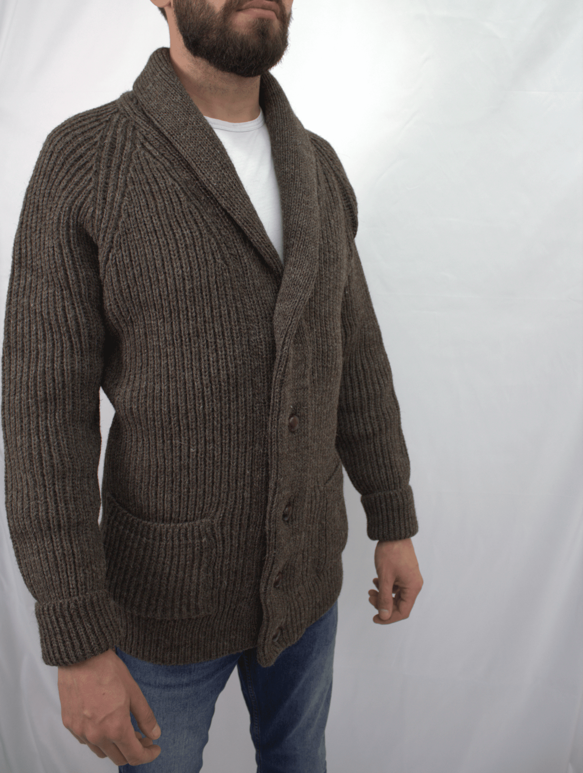 Shawl Collar Cardigan with raglan sleeves in a chunky fisherman rib knit, Richmond by Crystal Knitwear