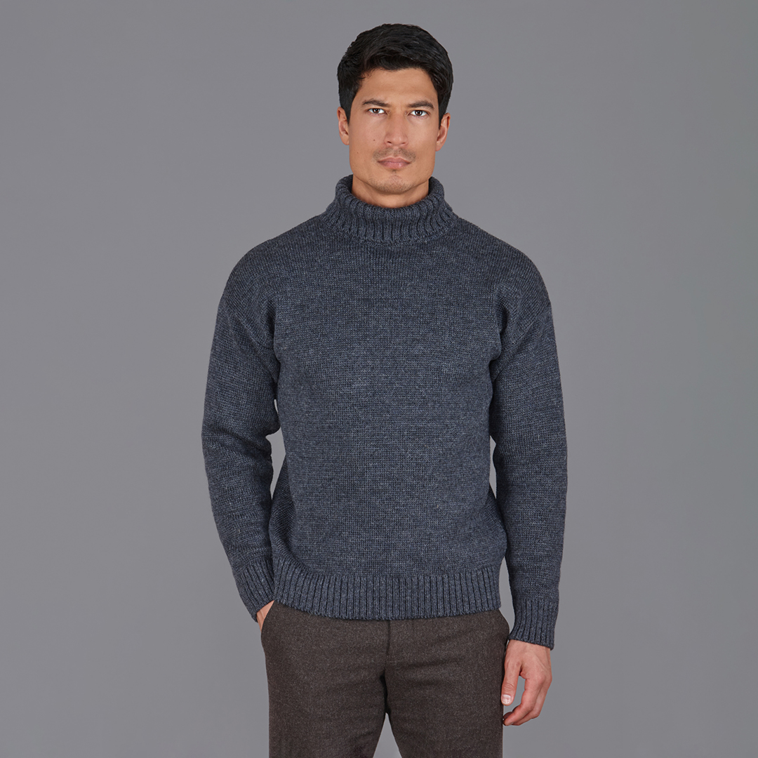 Our Walter submariner jumper is a hardy British wool version of our classic merino roll neck. Tough, durable and made to last, British wool is one our favourite winter yarns. A true workhorse, our Walter roll neck Submariner sweater is proudly made at our factory in Leicestershire, England, and has been designed to keep you warm during long country walks or quick trips to the shops.