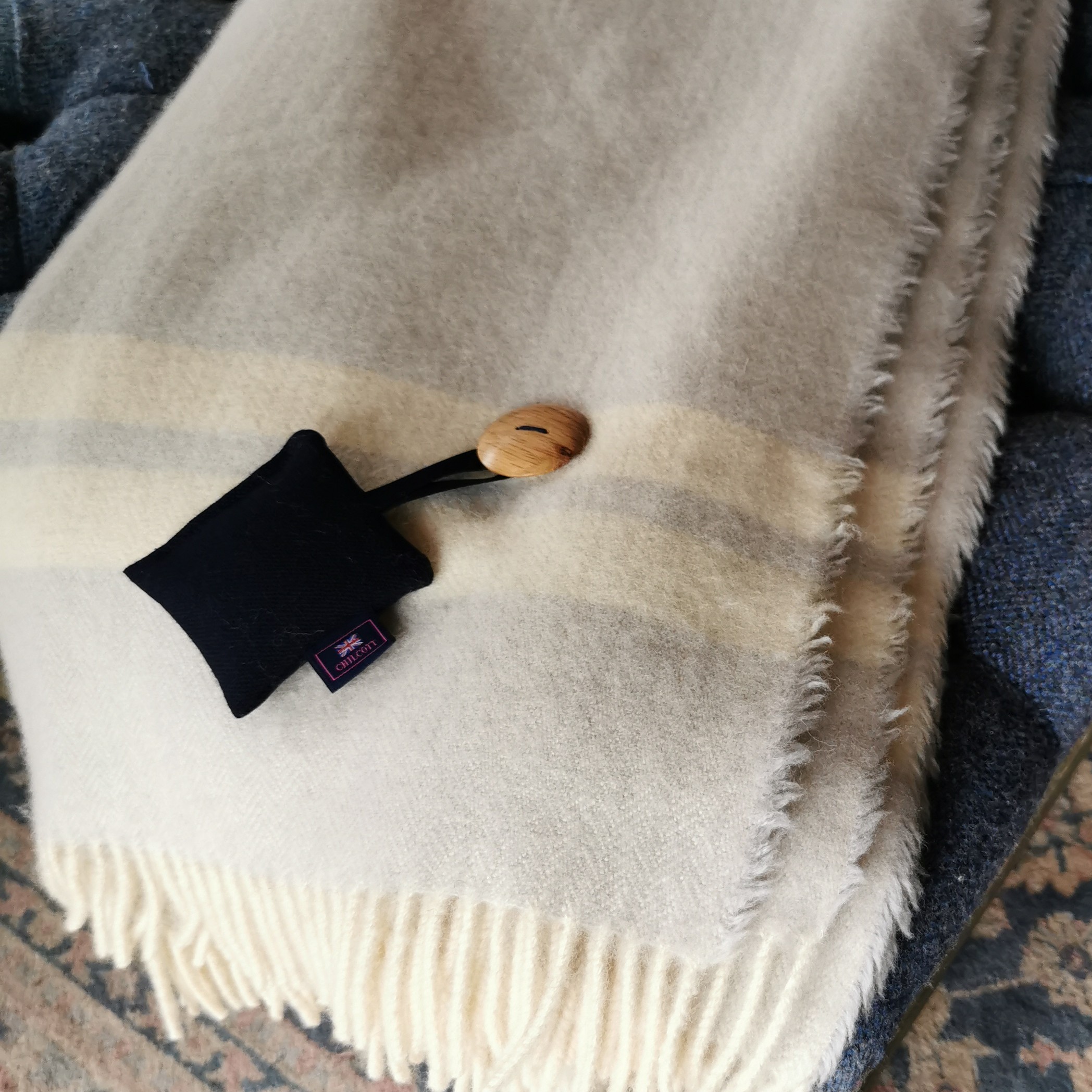 To complete the experience, each blanket comes with a bag of fresh Chilcott lavender, grown on our farm in the Brecon Beacons. The bag is attached with a hand-turned Welsh oak button, crafted by a local wood sculptor working from her studio on the banks of the River Usk. When your lavender bag begins to fade, simply return it to us and we’ll refill it for free – a lasting touch of care to keep your blanket beautifully fragranced for years to come.